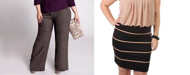 وبالنسبة للفستان، اختيار الموديلات ذات القصّة على شكل حرف A أو ذات الطيّات على الأفخاذ. كما تتناسب تنورة القلم الرصاص مع المرأة ذات السيقان الممتلئة، شأنها في ذلك شأن السروال الضيق ذو الوسط العالي وسروال مارلينه ذو الأرجل الواسعة. وكنموذج للتنسيق ينصح خبراء الموضة بارتداء سروال ضيق داكن اللون مع بلوفر طويل أو تونيك أو جاكت تريكو منسدل.