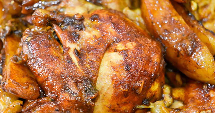المقادير: 1 دجاجة مقطعة 4 أجزاء 2 بصلة متوسطة مقطعة شرائح 3 ثمرات طماطم 2 باذنجان 2 بطاطا 3 ملاعق طعام زيت