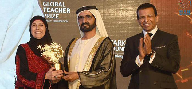 وسلم صاحب السمو الشيخ محمد بن راشد آل مكتوم نائب رئيس الدولة رئيس مجلس الوزراء حاكم دبي رعاه الله بحضور ولي عهده سمو الشيخ حمدان في محمد بن راشد آل مكتوم وسمو الشيخ مكتوم بن محمد بن راشد آل مكتوم نائب حاكم دبي جائزة المعلم العالمية وقدرها مليوم دولار أميركي إلى الفائزة المعلم حنان الحروب من فلسطين.