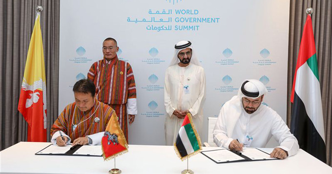 وشهد صاحب السمو نائب رئيس الدولة رئيس مجلس الوزراء حاكم دبي ورئيس وزراء مملكة بوتان، مراسم توقيع مذكرتي تفاهم بين دولة الإمارات وبوتان،الأولى وقعها معالي محمد بن عبدالله القرقاوي، وزير شؤون مجلس الوزراء والمستقبل ومعالي كين زانج وانج دي، أمين عام مجلس الوزراء البوتاني تتعلق بتطوير الإدارة الحكومية وتبادل الخبرة في هذا الشأن بين وزارة شؤون مجلس الوزراء والمستقبل والأمانة العامة لمجلس الوزراء في بوتان.