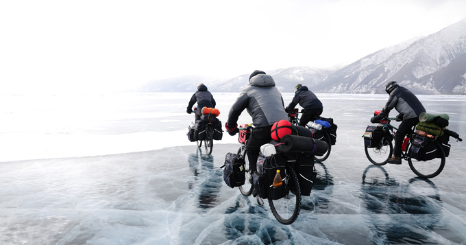 سباق للدراجات الهوائية فوق صفحة بحيرة بايكال المتجمدة