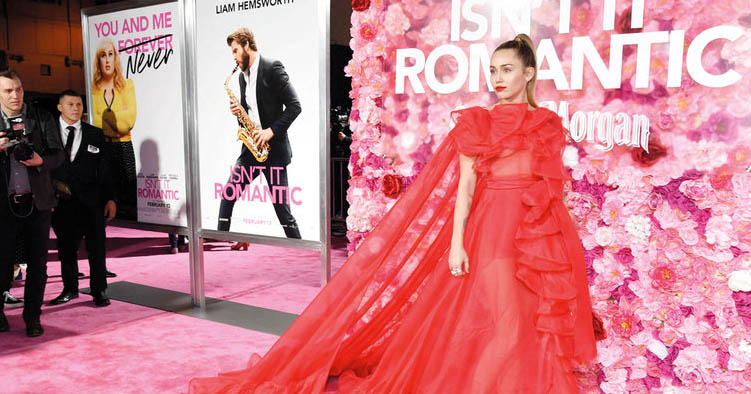 حضرت مغنية البوب مايلي سايرس حديثة الزواج عن زوجها ممثل هوليوود ليام هيمسورث في العرض الأول لفيلمه الأحدث "يا للرومانسية" (إزنت إت رومانتيك) بعد تعرضه لوعكة صحية.