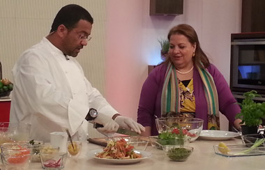 ويقدم الشيف علي سالم طبخات إماراتية ( شوربة اللوز / عصير تفاح أخضر مع الزنجبيل و البقدونس / سلطة مزلاي + سلطة الجبنة / لحم مدفون)
